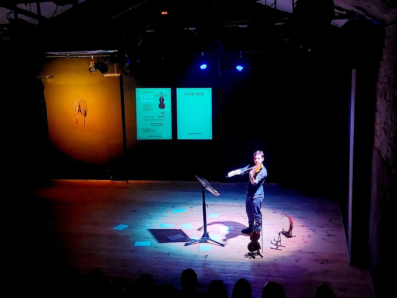 La puesta en escena que acompaña a este concierto genera un ambiente mágico y especial, muy conectado con la música nativo-americana, y con un espíritu de meditación que acompaña todo el evento. Se generan diferentes ambientes con la luz; uno de ellos, se centra en la figura del atril, los violines, la viola y el propio artista, desde donde irá interpretando las diferentes piezas; al fondo se estará proyectando, a lo largo de todo el concierto, un vídeo con distintas imágenes de los diferentes animales totémicos a los que la música va a ir haciendo referencia; y se generarán otros ambientes de luz, donde se resaltarán algunos elementos de la cultura nativo-americana.
